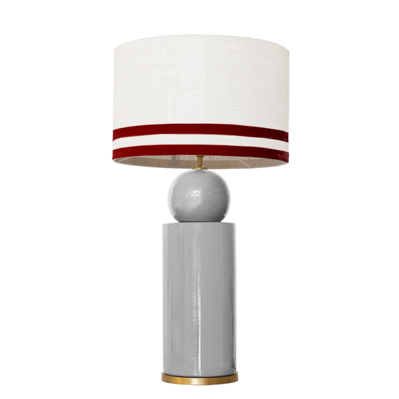 A beautifully elegant ceramic lamp that is 77cm high. Choose your favorite color and combine it with a 40cm x 40cm x 25cm lampshade. The lampshade is made of "LINO" fabric in Svel White color combined with velvet ribbons. The base is golden and flat.