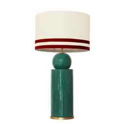 Lámparas de ceramica en craquelado y varios colores con pantalla de estilo tela "LINO" en color Svel Tostado combinado con cintas de terciopelo. La peana es dorada y lisa.